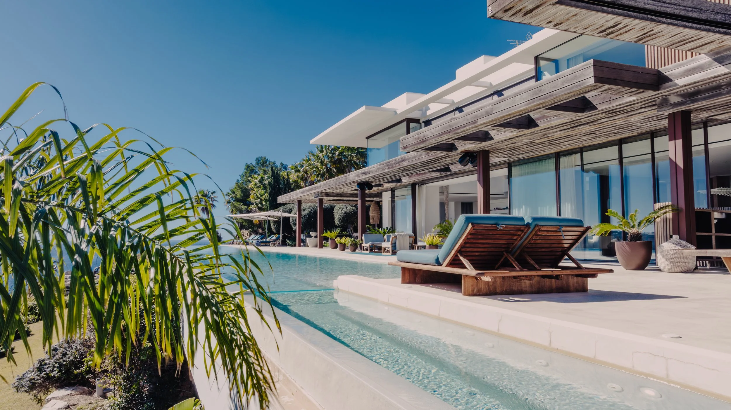 A spectacular 50-metre swimming pool stretches along the front of the property, complemented by vast terraces designed for both relaxation and sophisticated entertaining.