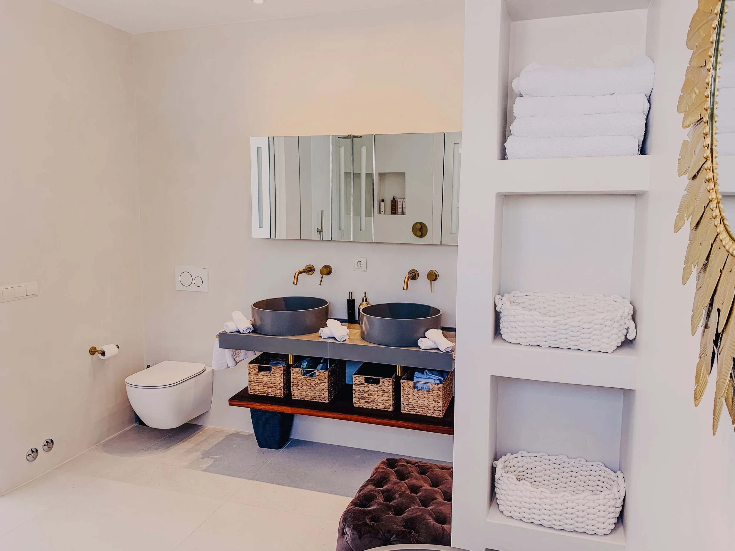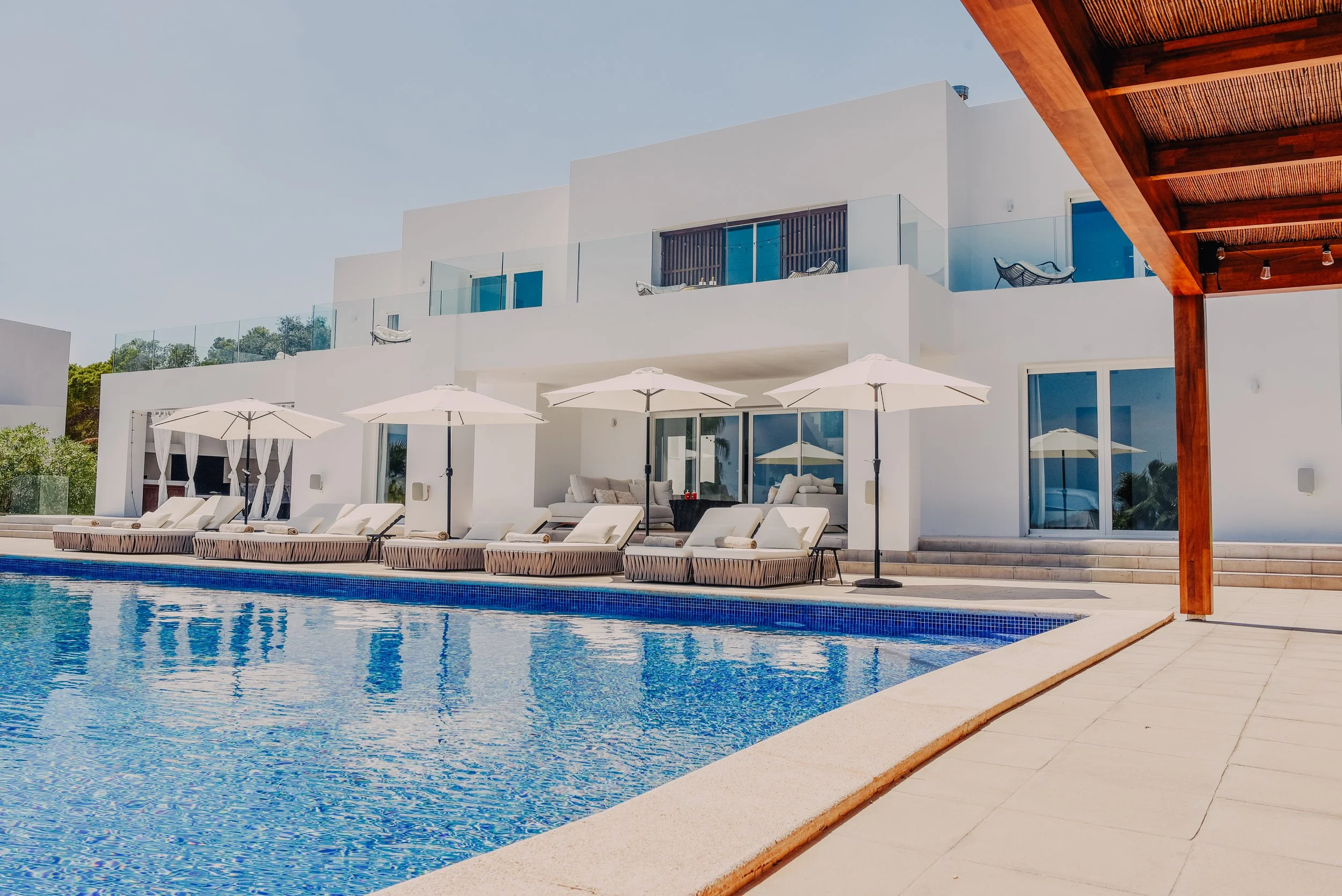 Designed by renowned architect, the double height ceilings of the living area create a feeling of grandeur and the large terrace windows allow for plenty of light to flood the tranquil atmosphere. All bedrooms are ample and include en suite bathrooms. Additionally to the fully equipped kitchen there is an exterior built in BBQ. Outside, a shady dining area, lounging sofas and sun beds invite to relax around the large swimming pool in a gorgeous covered chill out with amazing views. There is a gym as well as parking space for 4 cars.